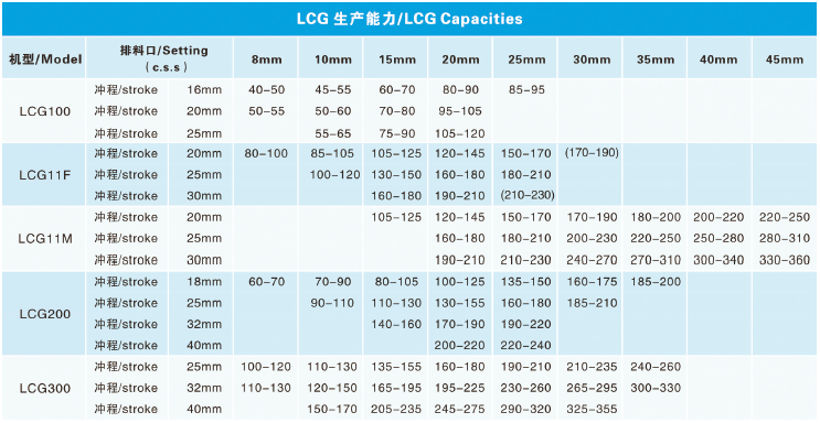 LUCKCOME LCG Series cone crushers can be easily adjusted for different production requirements. With a wide selection of cavities, the same crusher can be used in 2nd,3rd or 4th crushing stages, producing different end product sizes. The stroke change feature allows crusher through-