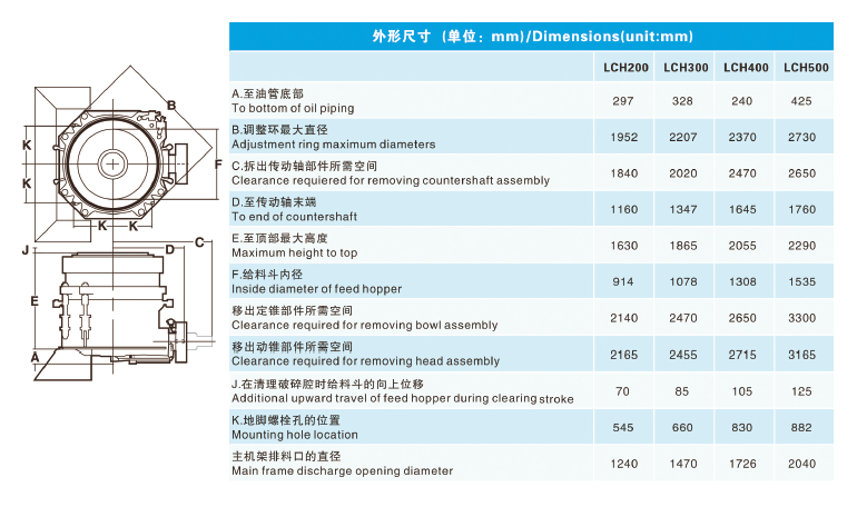 LCH series cone crushers can be converted from the finest to the coarsest simply by replacing the mantle, bowl liner, adapter ring and the wedge bolts.