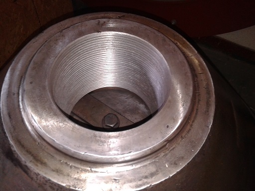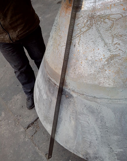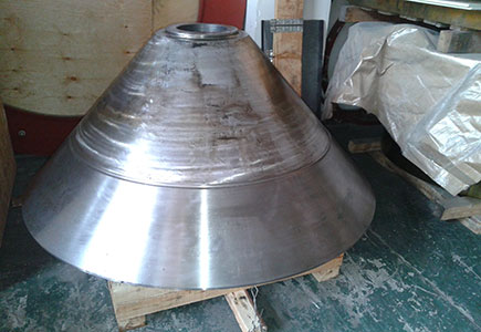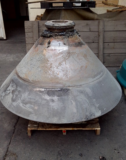 2014-06-10 客戶HP500 破碎機動錐體在更換襯板時發(fā)現(xiàn)鎖緊螺栓不能拆卸,運到我公司維修。由我司技術(shù)人員判定為動錐體內(nèi)螺紋損壞,同時檢查動錐體外錐面,發(fā)現(xiàn)磨損嚴重。