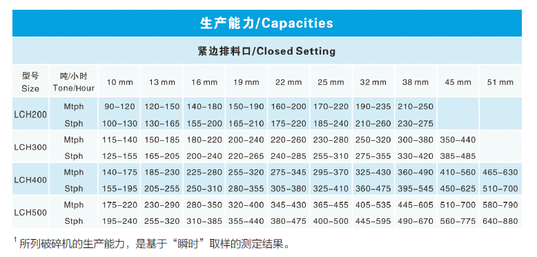 生產能力表可作為LCH 圓錐破碎機初步選型的工具,表中數據適用于松散密度1.6t/m3 的給料、給料中篩出小于排礦口粒級、開路作業條件下的生產能力。在給料中細粒級含量較高、閉路作業條件下,設備能力比開路作業高15%- 30%。破碎機作為生產回路中的一個重要組成部分,其性能的發揮部分取決于給料機、皮帶機、振動篩、支撐結構、電動機、傳動裝置及料倉等輔件的正確選擇和操作。